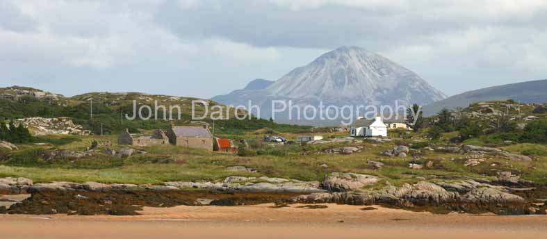Mount Errigal , DonegalThis unusual view of Errigal was taken from Cruit Island, 20km away to the west, using a long lens. Mount Errigal is the highest of the "Hills of Donegal". There may be clouds over the hills, but it's a beautiful August day on Cruit. |