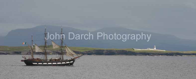St. John's Point , DonegalThe replica famine ship Jeannie Johnson sails out of Killybegs on her trip around the coast of Ireland. I waited three hours on Drumanoo Head for this shot. I arrived early and she was running two hours late. In fact, I had packed up and had started the long hike back to the road when the slap of sails had me dashing back to my vantage point. Photographers need a lot of patience! |