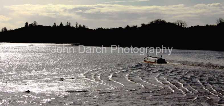 Donegal Bay , DonegalIt's 2004 so the old waterbus is still in operation. It was replaced with a new larger model, built locally in Killybegs, in 2006. Here she is seen setting off for a trip around Donegal Bay with the late afternoon sun catching the ripples from her wake. |