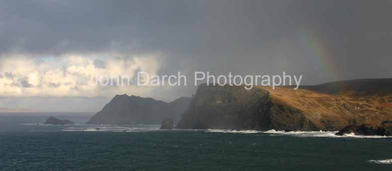 Glen Head, Glecolmcille , DonegalWinter showers! Sometimes you just have to get wet. I ran off alot of exposures on this one looking for the right balance between the rainbow and getting the sun on the headland. It's a fine juggling match between sun and rain over which the poor photographer has absolutely no control! The shot was taken from Rossan Point on a blustery day in January. |
