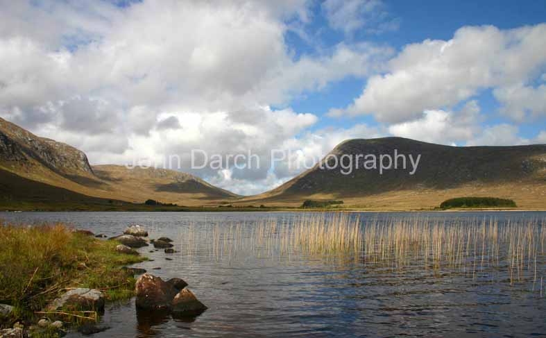 Lough Barra , DonegalLough Barra lies just to the east of the R254 approximately 5 miles north east of Doochary. The road continues on up through the pass that can be seen in the distance, between the Derryveagh and Glendowan Mountains, and offers views down Glenveagh to the castle. This shot involved a long wait, standing in the lough in my wellies until I was happy with the balance of light and shade on the distant hills. Fortunately, it was midsummer. |
