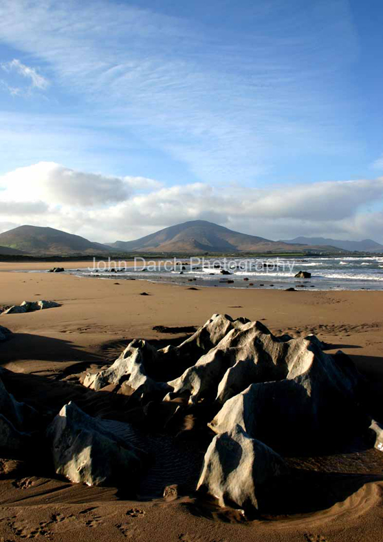 The strand below Camp, Dingle Peninsula, KerryThere are not many holidaymakers on the beach in December, just a few sea birds and the odd walker. Stradbally mountain in the middle distance Brandon Mountain beyond that. The Dingle Way follows the seemingly endless stretches of sandy beach along the south side of Tralee Bay. |