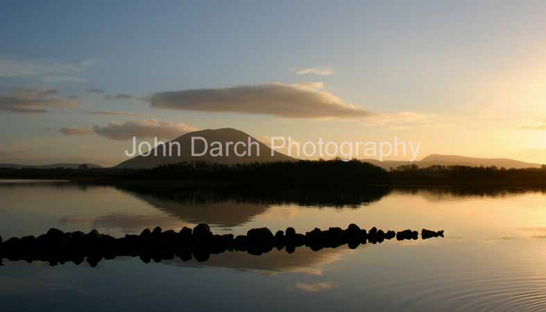 Ashleam Bay, Achill Island, MayoIt's late afternoon in February and the sun is setting in the west. Nephin is reflected in the still waters of Lough Conn. Still, that is, apart from the ripples created by a bunch of nosy cattle just out of shot to the right! |