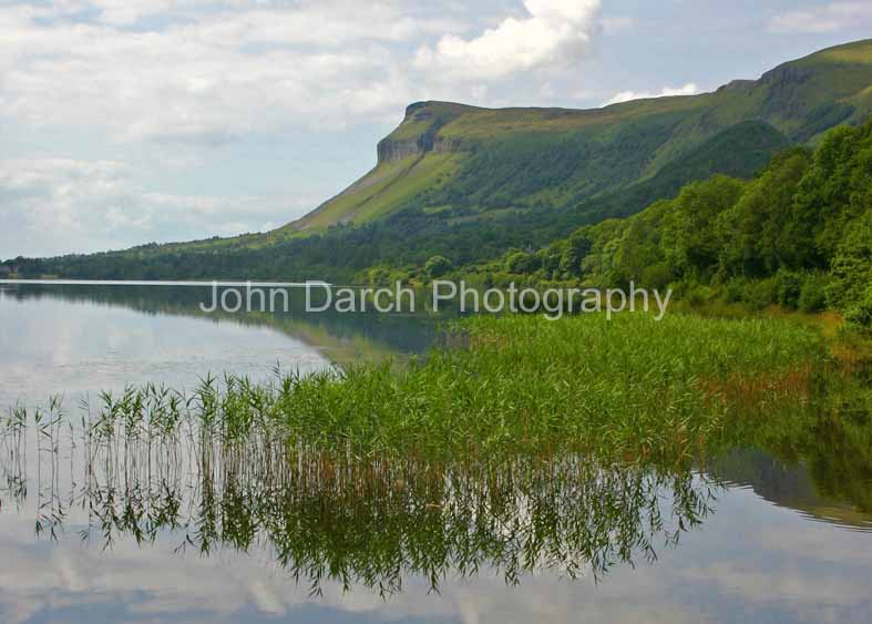 Glencar Lough and Kings Mountain , SligoReeds and mountain are sillouetted in the still waters of the lake on a mid summer's day. |